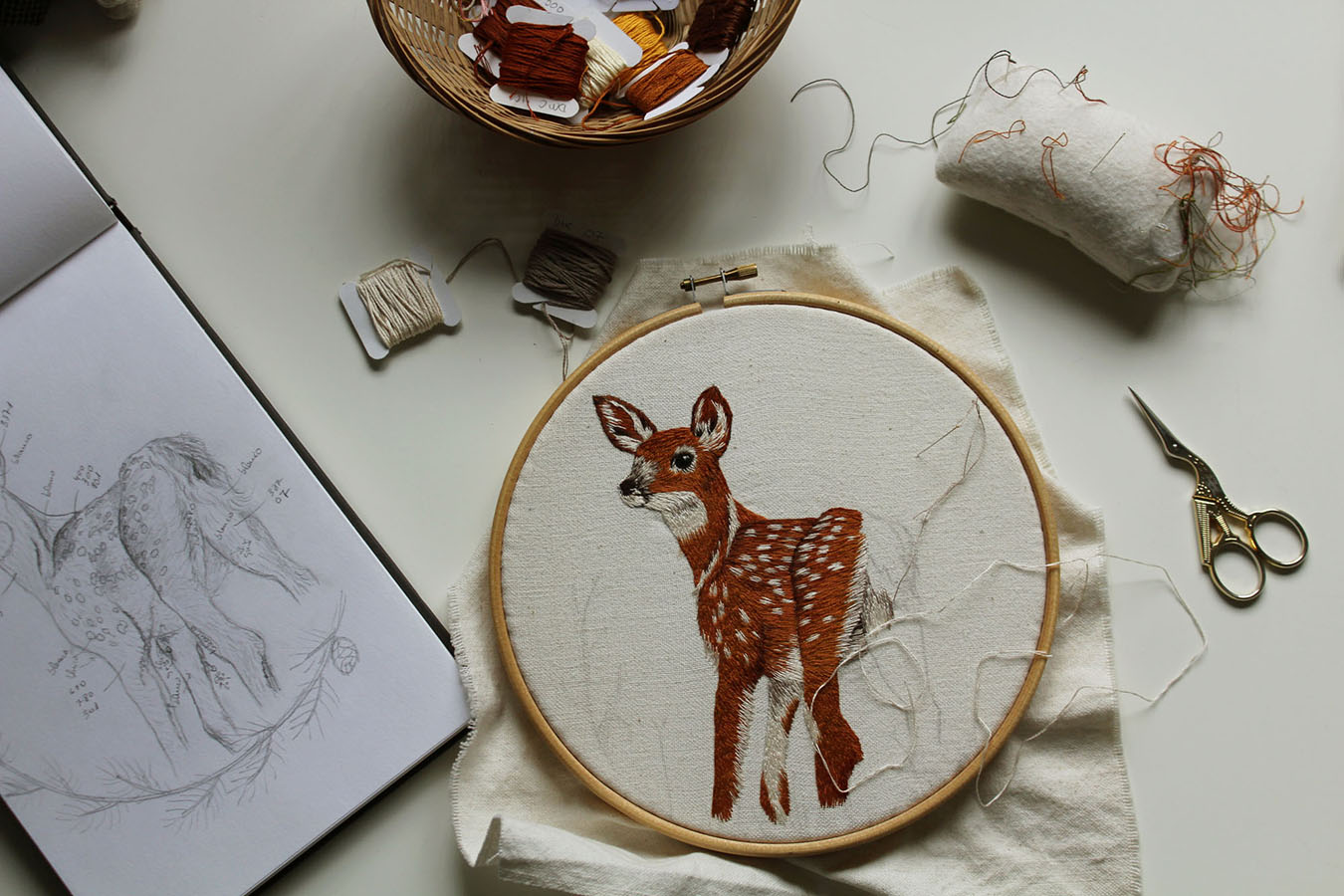 Cervatillo bordado con hilos de algodón ‘mouliné’ (1 hebra). Hojas de pino y piñas con hilo de algodón ‘cotton a broder’. Bordado durante el largo confinamiento, me ayudó a pasar mejor las tardes en casa.