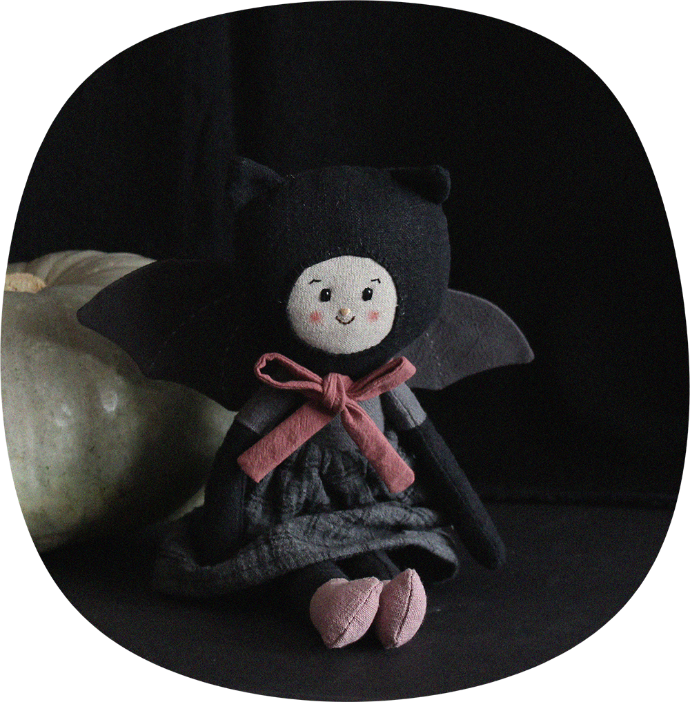Bat doll made with beautifull linen and cotton fabrics. It’s a limited collection.The wings are attached to the body with a ribbon and the skirt can be removed and put on. Details of face are hand-embroidered.