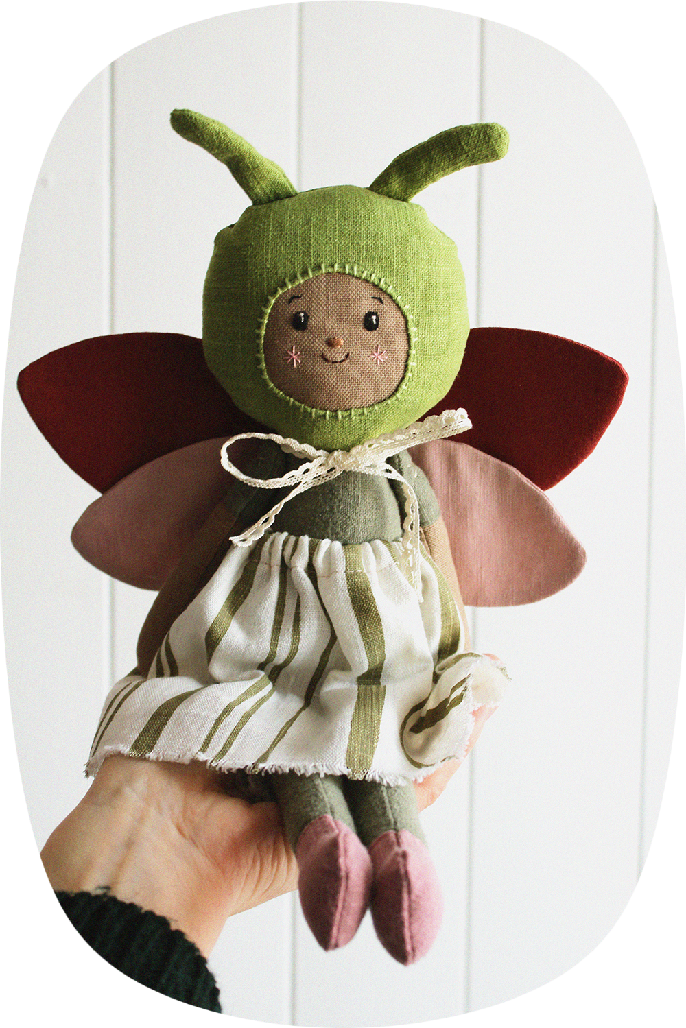 Unique heirloom doll, made with beautiful linen and cotton fabrics. The wings are attached to the body with a bow and the skirt can be removed and put on. Delicately hand-embroidered face details.