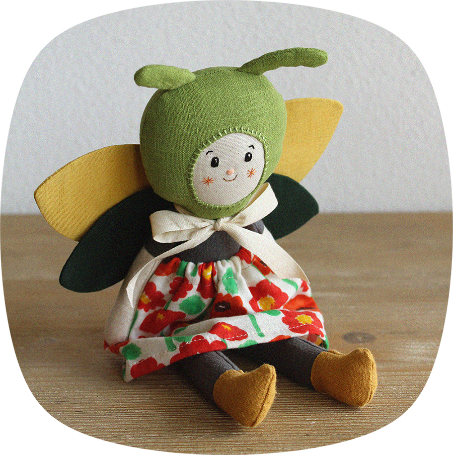 Muñeca de colección única e irrepetible, realizada con bonitas telas de lino y algodón. Las alas van sujetas al cuerpo con un lazo y la falda se puede quitar y poner. Detalles de la cara delicadamente bordados a mano.