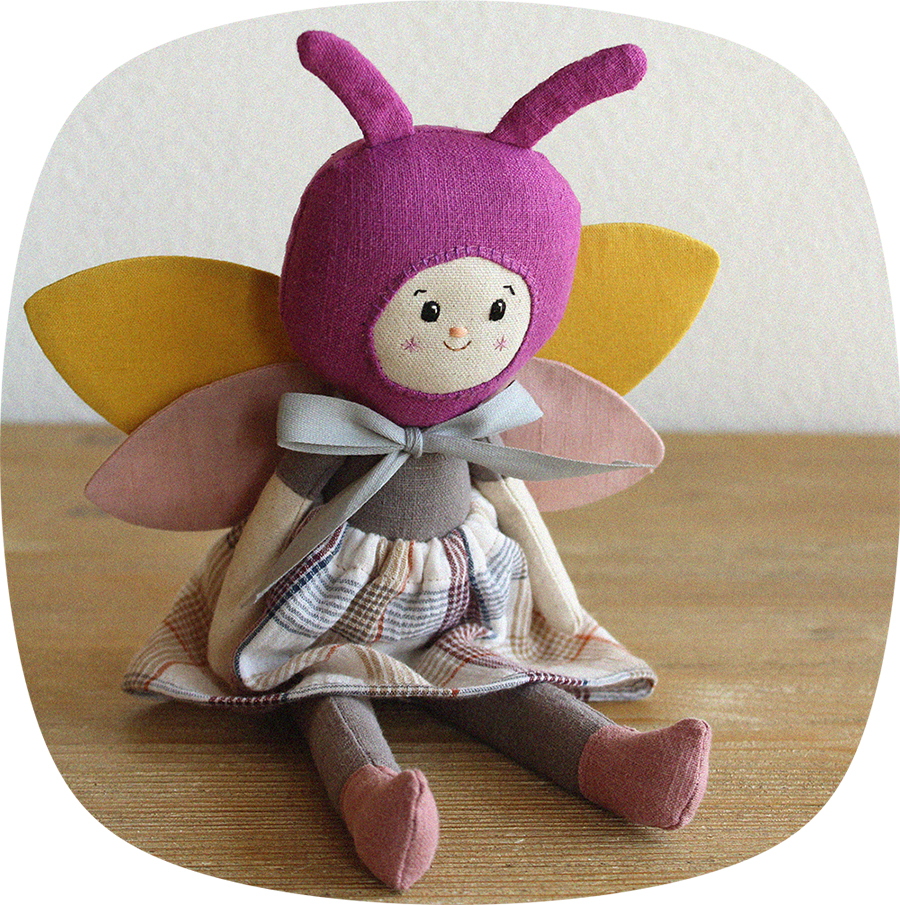 Muñeca de colección única e irrepetible, realizada con bonitas telas de lino y algodón. Las alas van sujetas al cuerpo con un lazo y la falda se puede quitar y poner. Detalles de la cara delicadamente bordados a mano.