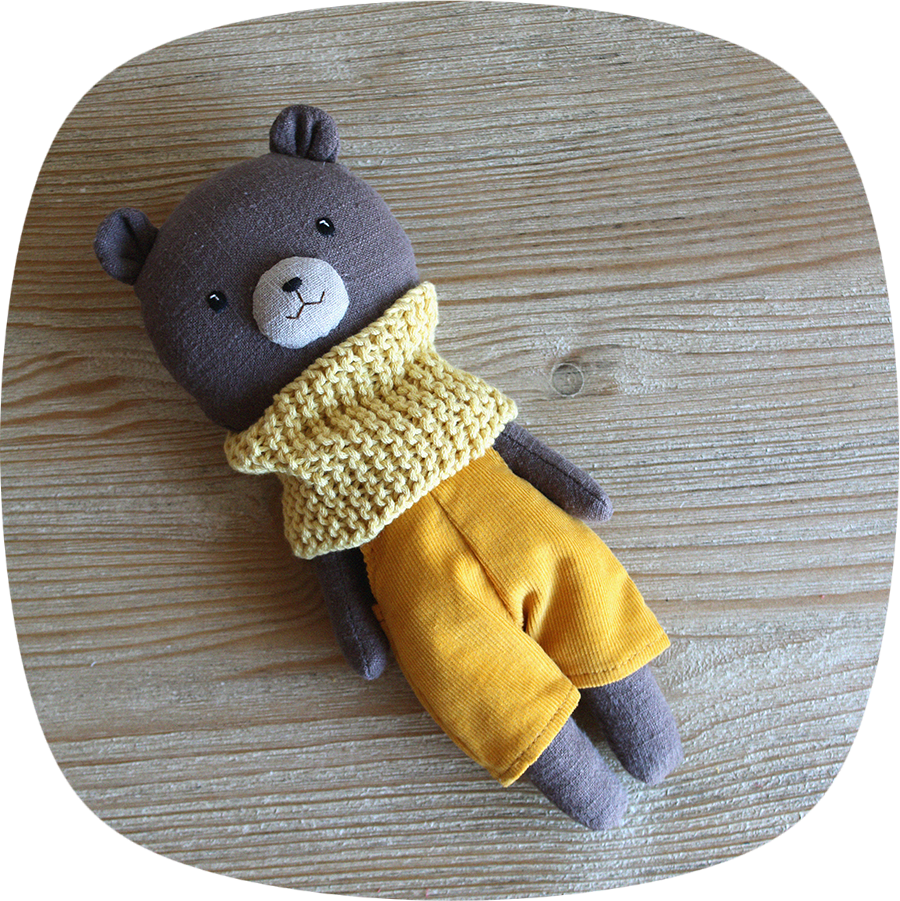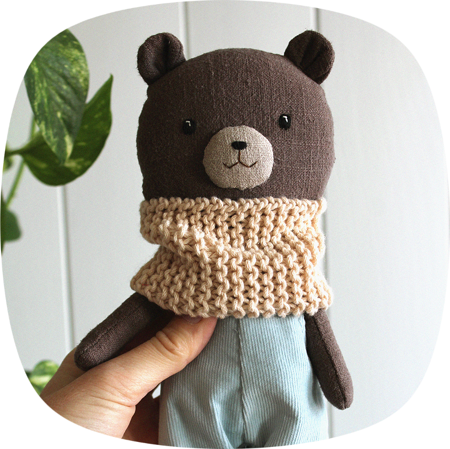 Cuidados: Puedes lavar el muñeco a máquina sin problemas utilizando un ciclo suave y dejando secar a la sombra, sin estrujar ni retorcer. La ropa y la bufanda recomiendo lavarlas a mano con agua fría.