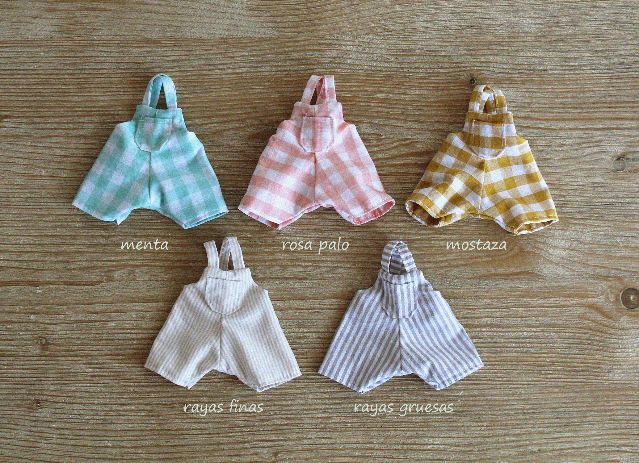 Elige el peto que más te guste, a cuadros vichy o a rayas, y pásatelo bomba jugando a cambiarle la ropa a tu muñeco.